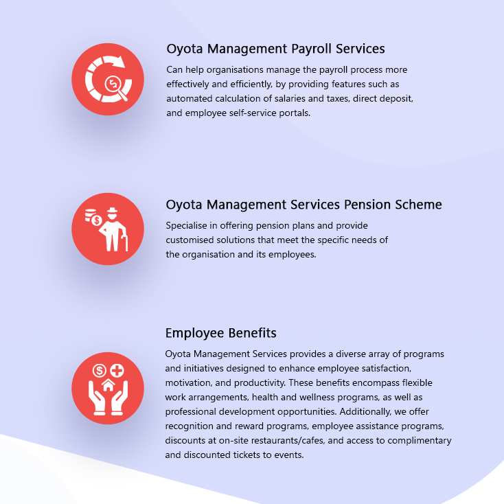 At Oyota Management Services, our mission is to be the catalyst for your company’s growth and success by providing exceptional and comprehensive HR solutions. As a trusted partner, we are committed to empowering businesses with the resources, expertise, and guidance they need to navigate the complex landscape of human resources and achieve their strategic objectives.